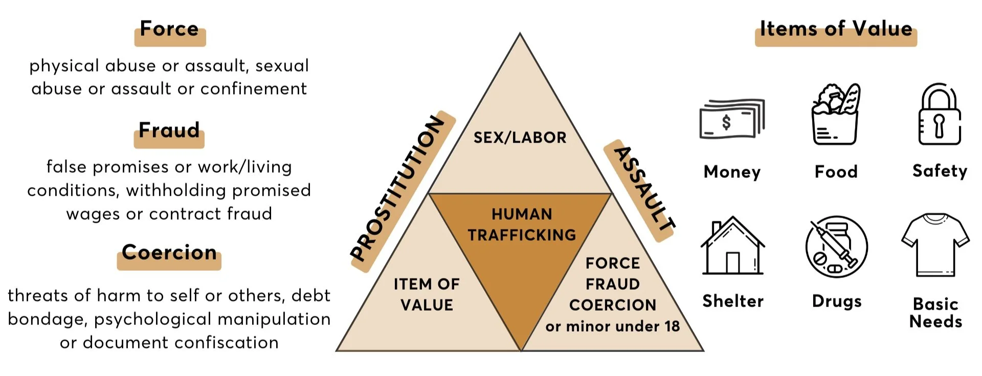 Human trafficking is the exploitation of humans for purposes such as sexual and labor servitude where something of value is exchanged (money, food, housing, drugs, etc.) through the means of force, fraud or coercion.
